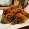 Mięso, frytki, sos + marchewką po koreańsku, abo pelyustką, abo sate.